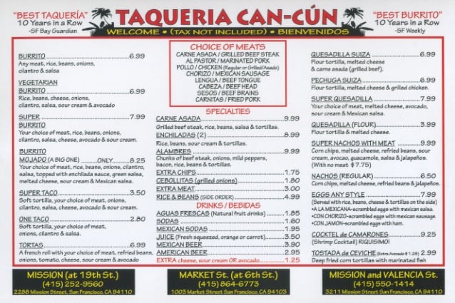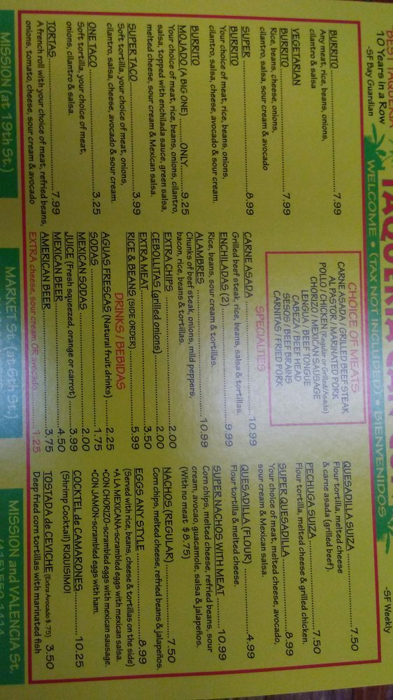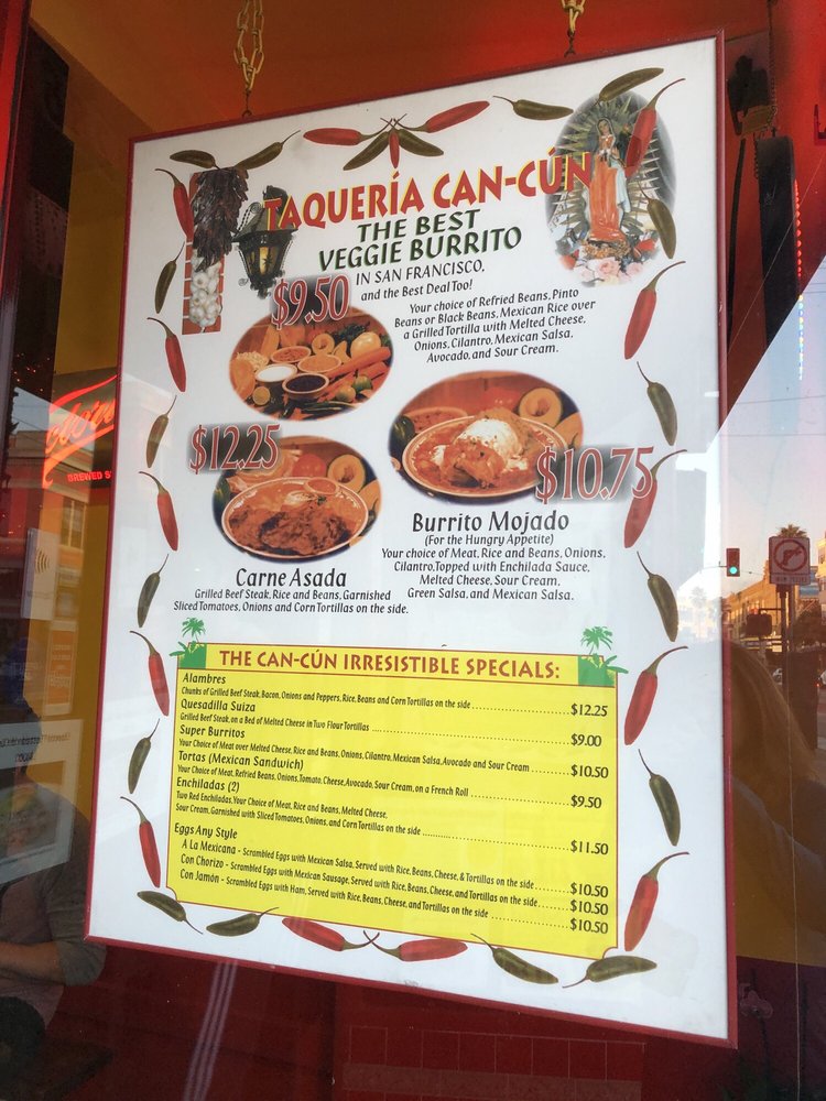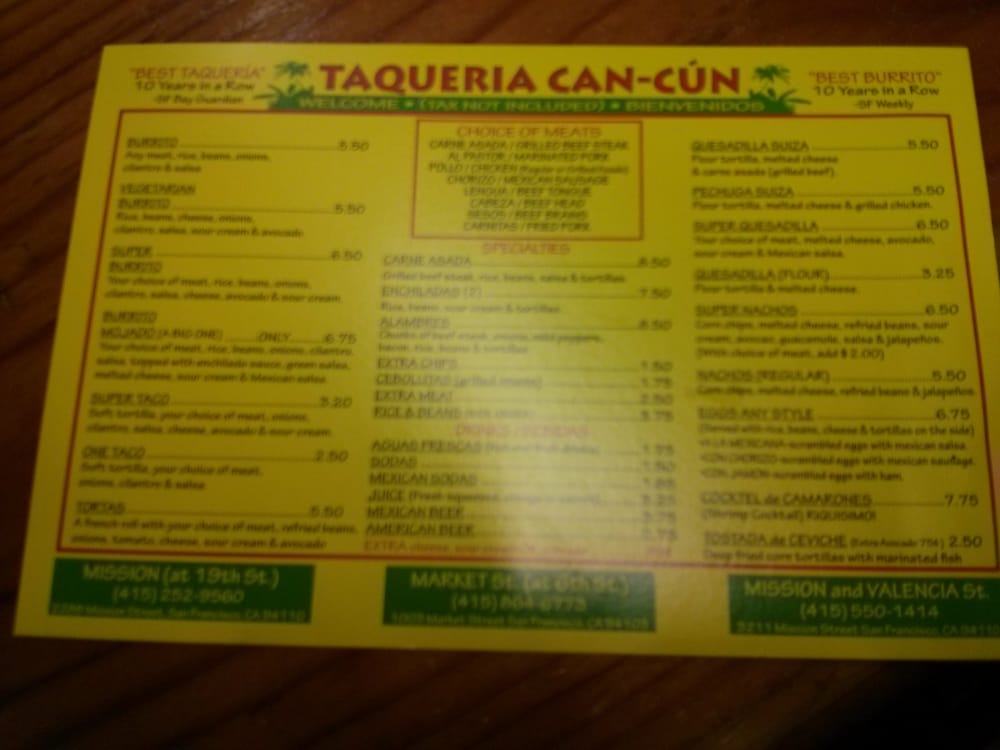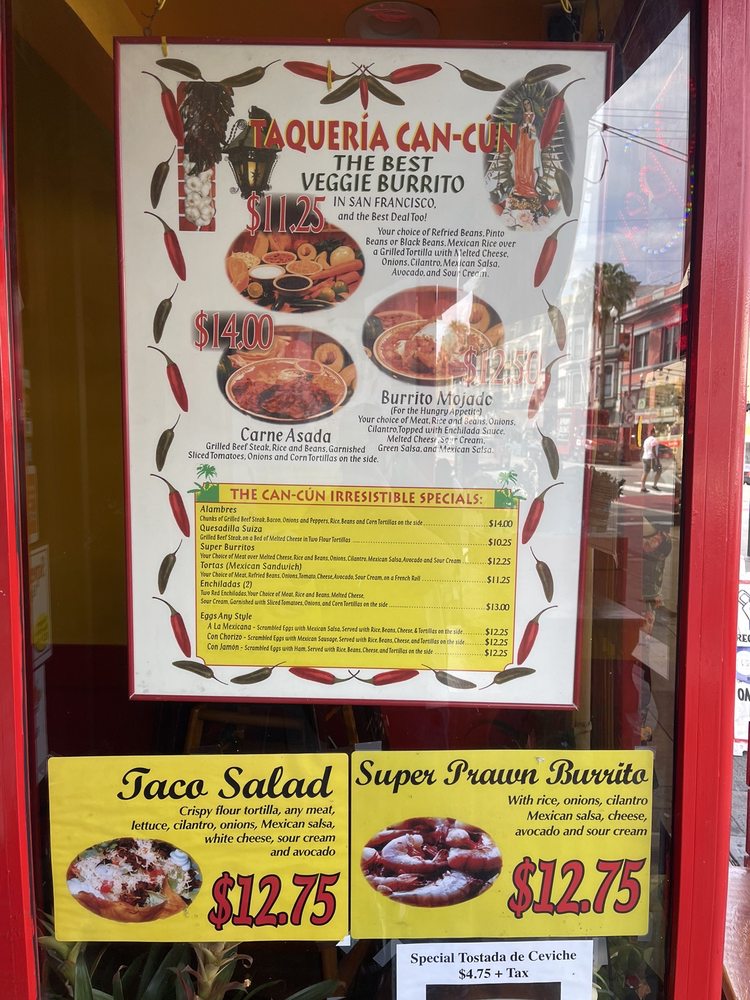 Taqueria Cancún, located in San Francisco, is a casual Mexican eatery offering a wide range of delicious options. From burritos to tacos, their menu is packed with flavorful choices like Carne Asada, Al Pastor, and Pollo. The Burrito Mojado stands out with its generous toppings and enchilada sauce. Customers rave about the vegetarian options and the friendly staff. The Super Tacos are a must-try, packed with well-spiced chicken and fresh toppings. With quick service and ample seating, Taqueria Cancún is a top choice for Mexican cuisine in the city. Whether you're looking for a quick bite or a sit-down meal, this place has something for everyone. Don't miss out on the authentic flavors and vibrant atmosphere at Taqueria Cancún.